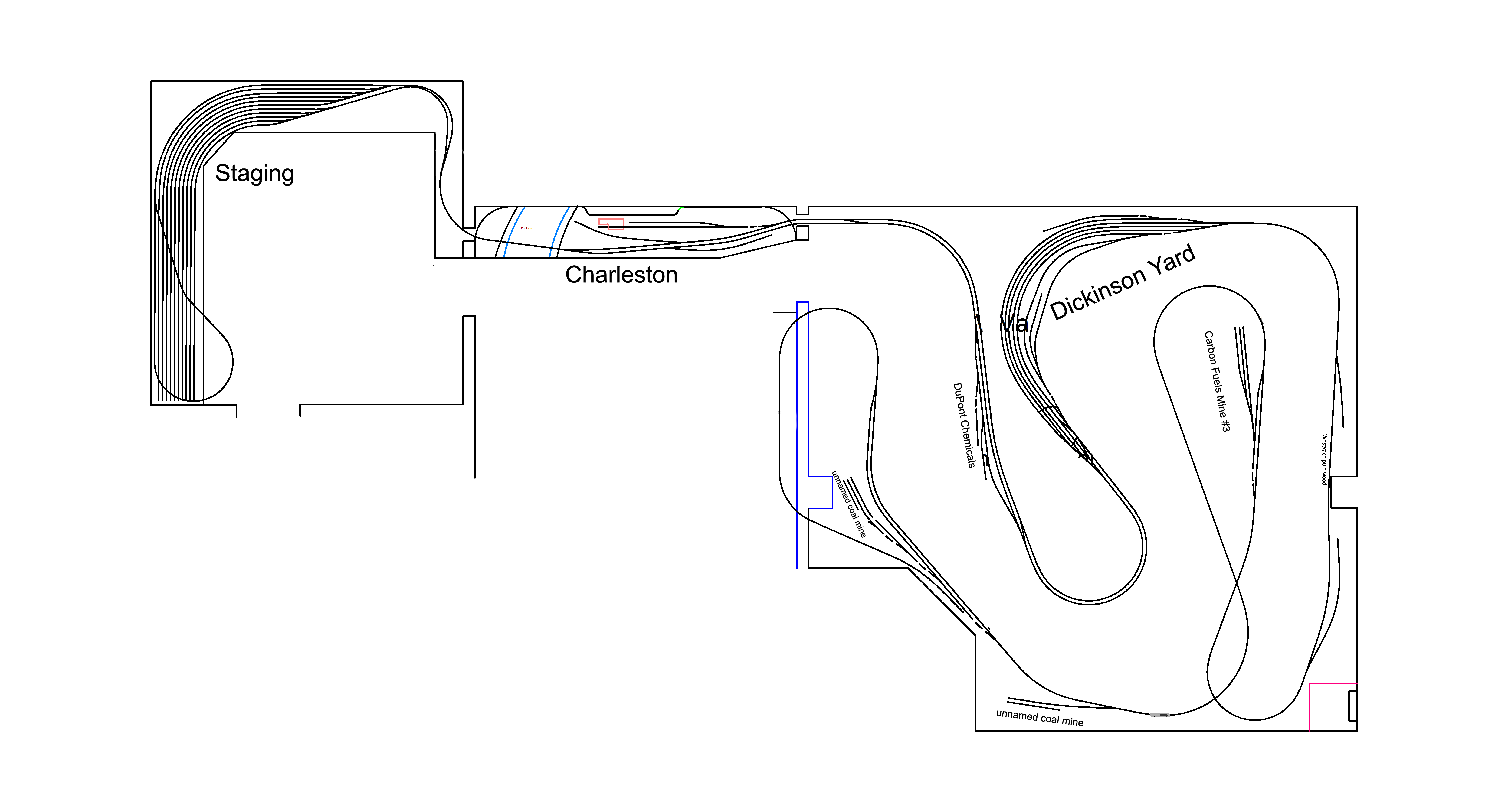 This was the KB&T v 1.0. The original idea for a KB&T track plan. This one was drawn using 3rdPlanIt. It was to be built in the basement, but before it got very far along, we moved. A version 2 is taking shape now as a much smaller and less ambitious shelf layout. It will focus on just the Charleston portion of this drawing. A track plan is under development. Pictures of how it is developing are on the “Pictures KB&Y v2 page linked above.